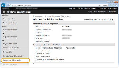 Se muestra la información sobre el equipo y el administrador del sistema. Esta información está establecida en [Gestión del sistema] en la página [Configuración].