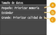 Cuando convierta documentos leídos a formato JPEG podrá especificar la escala de compresión del archivo. <Pequeño: Priorizar memoria> aumenta la escala de compresión más de lo normal para crear archivos más pequeños con una calidad de imagen inferior. Por otro lado, <Grande: Priorizar calidad de imagen> reduce la escala de compresión menos de lo normal para crear archivos más grandes con una calidad de imagen superior.