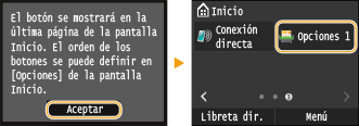 Si selecciona <Sí>, aparecerá un mensaje. Compruebe el mensaje y, a continuación, pulse <Aceptar>. La combinación de opciones registrada se agregará a la pantalla Inicio como un botón de acceso directo.