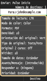 Las opciones registradas pueden visualizarse cuando sea necesario, por lo que no se necesitarán procedimientos complicados (por ejemplo, configurar el tipo de documento, especificar PDF compacto como formato de archivo y enviar el archivo a todo el personal interno) cada vez. También podrá asignar combinaciones de opciones registradas a un botón de acceso directo mostrado en la pantalla Inicio.
