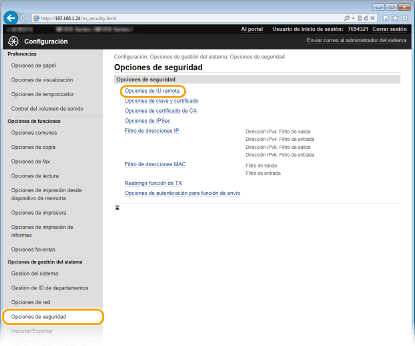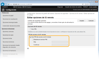 Marque la casilla de verificación [Usar PIN de acceso a la IU remota] y establezca el PIN.