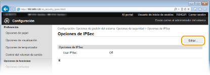 Uso del panel de controlTambién podrá activar o desactivar la comunicación IPSec desde <Menú> en la pantalla Inicio. Usar IPSec