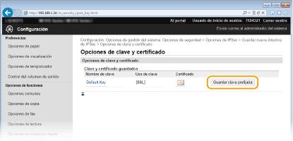 Haga clic en [Guardar clave prefijada] en la parte derecha del par de claves que desee utilizar.