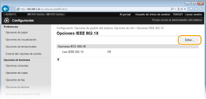 Uso del panel de controlTambién podrá activar o desactivar la autenticación IEEE 802.1X desde <Menú> en la pantalla Inicio. Opciones IEEE 802.1X