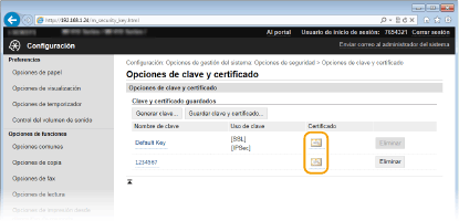 Haga clic en [Opciones de clave y certificado] para verificar un par de claves o en [Opciones de certificado de CA] para verificar un certificado de CA.