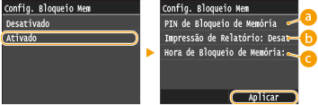 Para armazenar documentos na memória, defina <Configurações de Bloqueio de Memória> para <Ativado>. Você também pode especificar configurações opcionais, tais como uma configuração de segurança que torna necessária uma senha para desbloquear o recurso e uma configuração de tempo que especifica um período de tempo durante o dia no qual os documentos recebidos serão armazenados na memória.