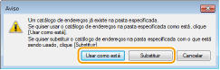 Se os dados do Catálogo de endereços já existir na localização da pasta especificada na etapa 5, a seguinte mensagem será exibida. Se deseja usar o Catálogo de endereços existente, clique em [Usar como está], e se deseja sobrescrevê-lo com o Catálogo de endereços atual, clique em [Substituir].