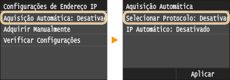 ![]() Se <Ativado> for exibido, toque em <Aquisição Automática> e defina ambos <Selecionar Protocolo> e <IP Automático> para <Desativado>.