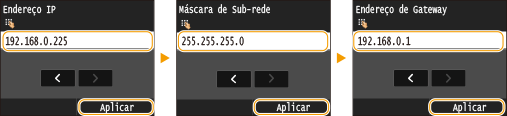 <Máscara de Sub-rede> <Endereço de Gateway>.Insira cada configuração usando o teclado numérico e toque em <Aplicar>.
