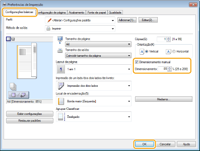 As configurações de ampliação/redução em alguns aplicativos possuem prioridade sobre as configurações do driver de impressora.