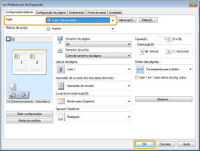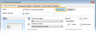 Clique nas guias [Configurações básicas], [Configuração de página], [Acabamento], [Fonte de papel] ou [Qualidade] para especificar em cada tela conforme necessário.