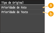 Você pode selecionar o tipo de original dependendo da imagem a ser impressa. Selecione <Prioridade de Foto> ou <Prioridade de Texto>.