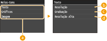Você pode selecionar o método de impressão para reproduzir meios-tons (o intervalo intermediário entre as áreas mais claras e mais escuras de uma imagem) para a qualidade de imagem ideal. Toque em <Graduação> ou em <Difusão de Erro>.