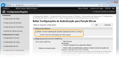 Nenhuma tela de autenticação é exibida quando e-mails ou I-Faxes são enviados. A autorização no servidor SMTP é realizada usando o nome de usuário e senha definidos em [Configurações de E-mail/I-Fax] Definindo as configurações de comunicação por e-mail/I-Fax.