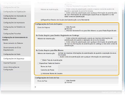 Quando a opção [Permitir] está especificada em [Envio de Arquivo]