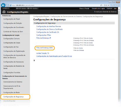 Clique em [Configurações de Segurança]  [Filtro de Endereço MAC].