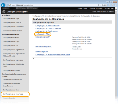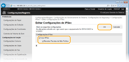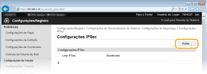 Usando o painel de operaçõesTambém é possível ativar ou desativar a comunicação IPSec no <Menu> da tela Início. Usar IPSec