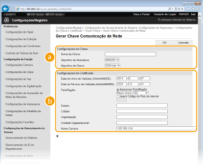 Um par de chaves pode ser gerado com a máquina quando for necessário para comunicações codificadas via Transport Layer Security (TLS). Você pode usar o TLS ao acessar a máquina através da Interface de Usuário Remota. É possível gerar até cinco pares de chaves para a máquina, incluindo os pares instalados. Certificados autoassinados são usados com pares de chaves gerados na "Comunicação de Rede". Com uma "Chave e Solicitação de Assinatura de Certificado (CSR)", é possível solicitar um certificado digital emitido por uma CA para o par de chaves gerado pela máquina.
