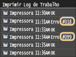 Se ocorre um erro tal como quando a impressão não é bem sucedida, ou quando não é possível enviar ou receber um documento de fax ou digitalizado, o código de erro correspondente é exibido em um relatório ou na tela <Log do Trabalho> como um número de três dígitos. Verifique o seguinte para descobrir as causas e soluções de cada código de erro. Para imprimir um relatório de erro e informação, consulte