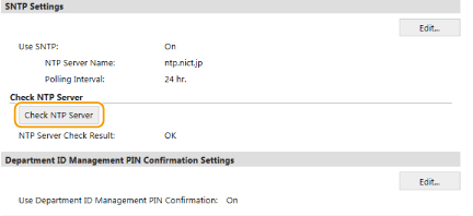[Network Settings] [TCP/IP Settings] and then clicking [Check NTP Server] in [SNTP Settings] that appears. If a proper connection has been established, the result is displayed as shown below. Note that this operation does not adjust the system clock.![]() |