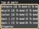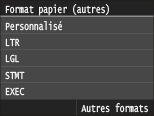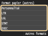 Si l'écran illustré ci-dessus ne s'affiche pas lorsque le papier est chargéSi vous chargez toujours le même papier dans le bac multifonctions, vous pouvez ignorer les opérations de configuration du papier en définissant par défaut le format et le type de papier. Notez que si un paramètre par défaut est enregistré, l'écran illustré ci-dessus ne s'affiche pas. Pour afficher l'écran, sélectionnez <Spécifier lors du chargement du papier> (Enregistrement des paramètres papier par défaut du bac multifonctions).