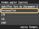 Une fois les paramètres papier par défaut enregistrés, l'écran de définition du papier ne s'affiche plus lorsque vous insérez du papier, et les mêmes paramètres sont appliqués systématiquement. Si vous chargez un papier de format ou de type différents sans modifier les paramètres papier, l'appareil risque de ne pas imprimer correctement. Pour éviter ce problème, sélectionnez <Spécifier lors du chargement du papier> à l'étape 3, puis chargez le papier.