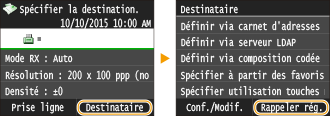 Vous pouvez sélectionner un destinataire parmi les trois derniers destinataires. Lorsque vous désignez un destinataire que vous avez déjà utilisé, l'appareil réutilise les mêmes réglages de télécopie que ceux qu'il a utilisés lors de l'envoi des documents au destinataire en question.
