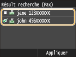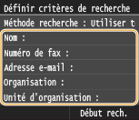 Le nom, les numéros de fax, les adresses e-mail, les noms d'entreprises et les services peuvent servir de critères de recherche de destinataires.