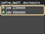 Avant d'appuyer sur <Destinataire> à l'étape 1, vous pouvez appuyer sur  /  pour consulter, un à un, les destinataires que vous avez spécifiés. Affichez le destinataire à supprimer et appuyez sur  .