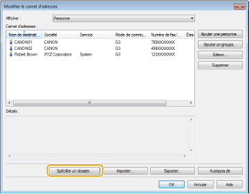 L'emplacement d'enregistrement des données du carnet d'adresses peut être affecté à n'importe quel dossier. Vous ne pouvez pas utiliser le carnet d'adresses si vous n'avez pas le droit d'accéder au dossier où celui-ci est enregistré. Dans ce cas, modifiez l'emplacement d'enregistrement du carnet d'adresses.