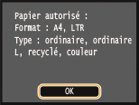 Contrôlez que le format et le type du papier mentionnés à l'écran correspondent au papier chargé dans l'appareil et appuyez sur <OK>.