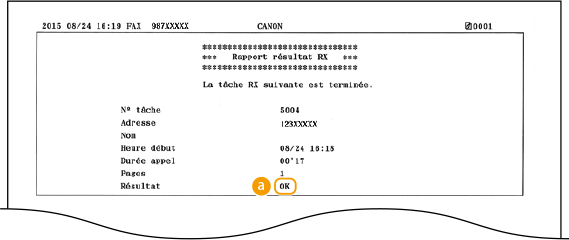 Il est possible de consulter les journaux de fax ou d'I-Fax reçus en imprimant un Rapport résultat RX. Il est possible d'imprimer ce rapport à l'issue de chaque transmission ou en cas d'erreur lors de la réception.