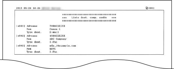 Vous vérifiez la liste des destinataires mémorisés dans le carnet d'adresses à l'aide des options <Composition codée>, <Favoris> et <Comp. groupe> en imprimant la liste du carnet d'adresses.