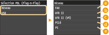 Sélectionnez une langue de description de page de sorte que l'appareil soit détecté en tant qu'imprimante compatible avec cette langue lorsqu'il est relié à un ordinateur par Plug-n-Play.