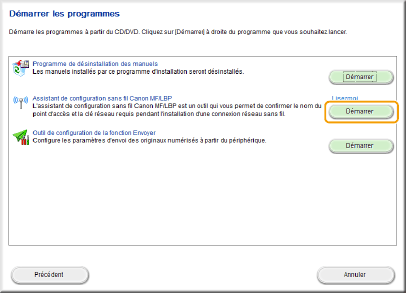 Cliquez sur [Démarrer], pour [Assistant de configuration sans fil Canon MF/LBP].