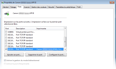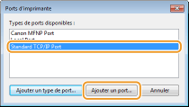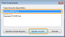 ![]() Vous ne pouvez ajouter un port MFNP que si vous avez installé le pilote d'imprimante ou de fax à partir du DVD-ROM fourni ou bien à partir du site Web Canon.