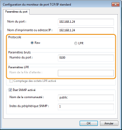 Il s'agit d'un port Windows standard. Lorsque vous utilisez ce type de port, vous devez ajouter un nouveau port dès que l'adresse IP de l'appareil est modifiée. Sélectionnez ce type de port lorsque vous utilisez l'appareil dans un environnement IPv6 et lorsque vous ne pouvez pas ajouter un port MFNP.