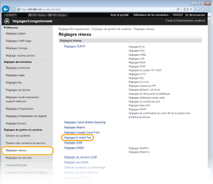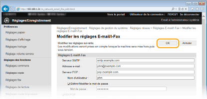 Utilisez l'interface distante pour définir les paramètres détaillés d'envoi et de réception, notamment les paramètres d'utilisation de l'appareil pour l'envoi et la réception des I-Fax et les paramètres d'authentification POP ainsi que le cryptage avant tout envoi d'e-mails ou d'I-Fax. Contactez votre fournisseur ou votre administrateur réseau pour les paramètres requis.