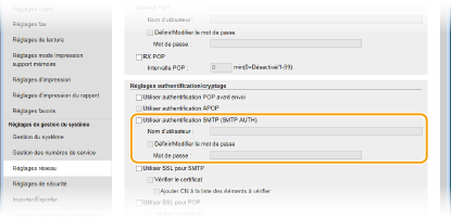 Si vous configurez l'authentification SMTP (AUTH SMTP), l'identification utilisateur par nom et mot de passe s'exécute lors de l'envoi de l'e-mail ou de l'I-Fax.