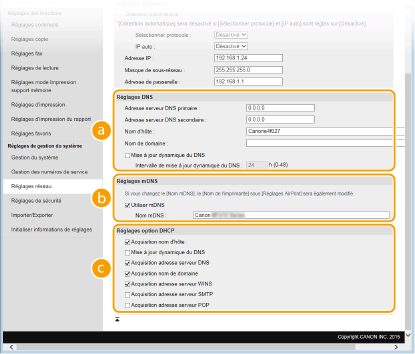 Adopté par Bonjour, le protocole mDNS (multicast DNS) est un protocole associant le nom d'hôte à une adresse IP sans faire intervenir le DNS. Cochez la case pour activer mDNS et saisissez le nom mDNS dans la zone de texte [Nom mDNS]. [Réglages option DHCP][Acquisition nom d'hôte]