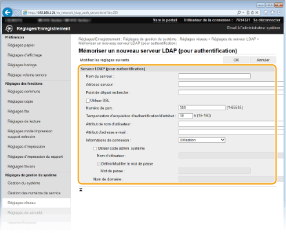 L'enregistrement de serveur LDAP est distinct, avec un enregistrement soit pour la recherche soit pour l'authentification. Pour utiliser un serveur pour la recherche de destinataire de fax et d'e-mails, enregistrez-le pour la recherche, et pour l'utiliser pour l'envoi d'authentification d'e-mail ou de fax, enregistrez-le pour l'authentification.