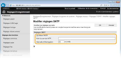 Test des communications avec le serveur NTP/SNTPVous pouvez afficher l'état des communications avec le serveur enregistrer en cliquant sur [Réglages/Enregistrement]