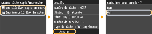 Annulation à partir de l'IU distanteVous pouvez annuler l'impression dans la page [Statut tâche] de l'interface utilisateur distante : Vérification de l'état actuel des documents d'impression
