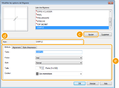 Cliquez sur chacun des onglets pour définir le texte, la couleur ou la position d'impression du filigrane. Pour en savoir plus, cliquez sur [Aide] dans l'écran du pilote d'imprimante.