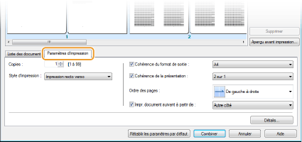 Cliquez sur l'onglet [Paramètres d'impression] pour afficher l'écran destiné à définir la configuration de l'impression telle que le nombre de copies et l'impression recto/recto verso. Les réglages spécifiés à ce stade concernent l'intégralité de la tâche d'impression.