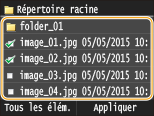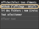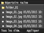 ![]() ![]() Lorsque vous sélectionnez <Date/Heure (Croissant)> ou <Date/Heure (Décroissant)>, le classement des fichiers s'effectue selon la date et de l'heure de modification des fichiers.