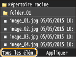 ![]() ![]() Si vous avez sélectionné un fichier avant d'appuyer sur <Tous les élém.>, vous ne pouvez sélectionner que des fichiers du même format.