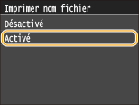 Si vous appuyez sur <Activé>, vous pouvez imprimer le nom du fichier en dessous de chaque image.