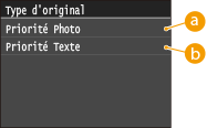 Vous pouvez sélectionner le type d'original en fonction de l'image à imprimer. Sélectionnez <Priorité Photo> ou <Priorité Texte>.