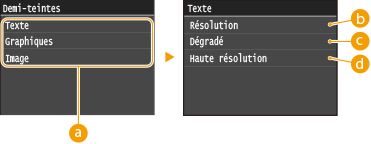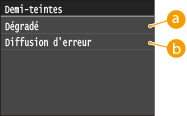 Vous pouvez sélectionner le mode d'impression pour reproduire les demi-teintes (partie intermédiaire entre les zones claires et les zones foncées d'une image) pour obtenir une qualité d'image optimale. Appuyez sur <Dégradé> ou <Diffusion d'erreur>.